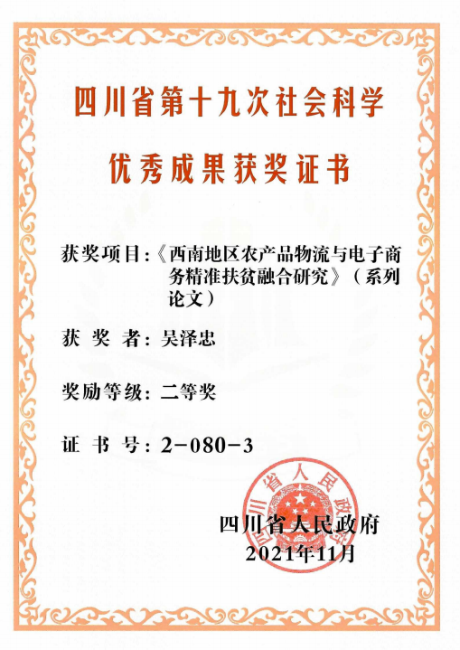 副院长吴泽忠教授参与的《西南地区农产品物流与电子商务精准扶贫融合研究》系列论文荣获四川省第十九次社会科学优秀成果二等奖。