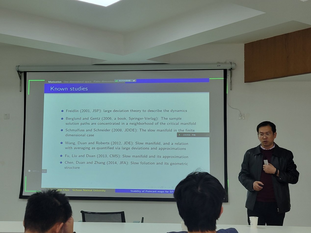 邀请,四川师范大学的陈光淦教授在我校做了题为Stability of the Poincaré maps for slow-fast stochastic systems的学术报告。
