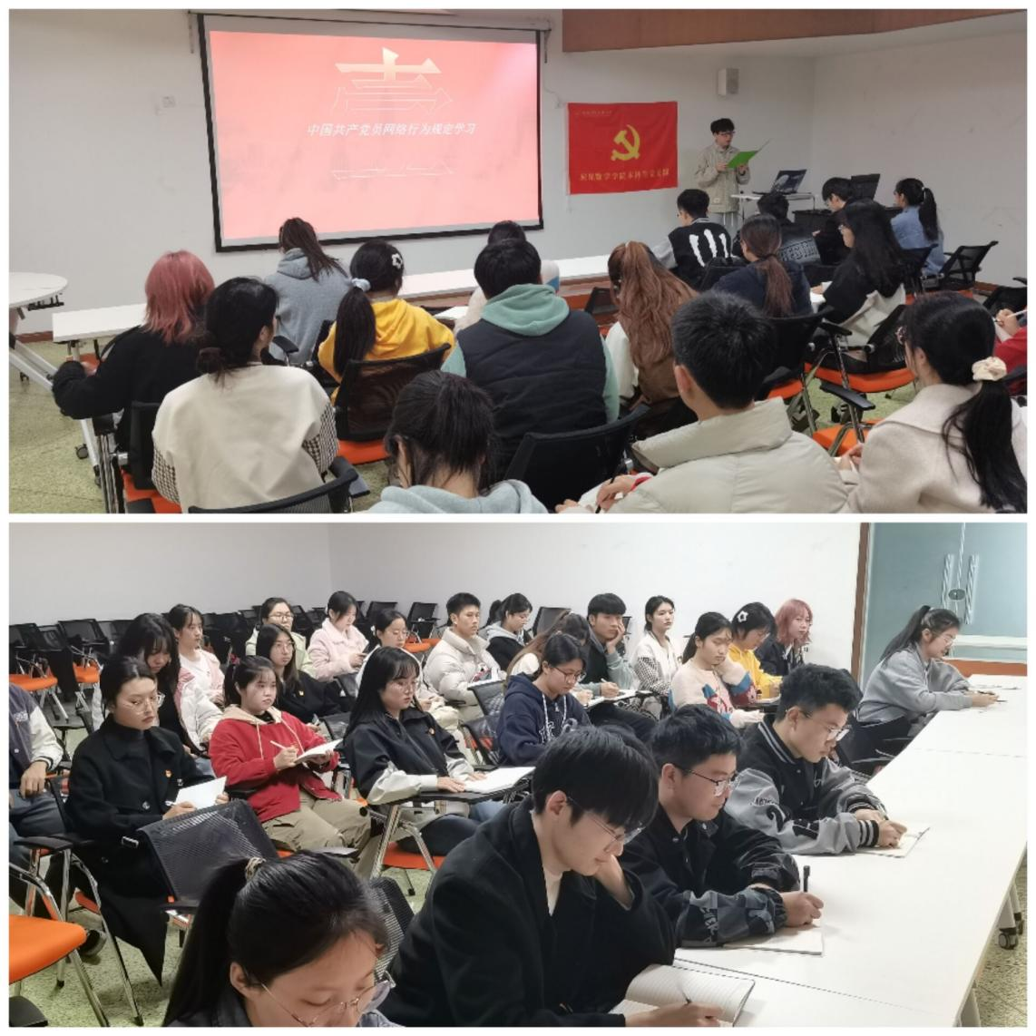 本科生党支部开展专题学习。杨庄同志带领学习,他强调党员同志在网络上要严守政治纪律和政治规矩,严格遵守党规党纪,模范遵守国家法律法规。