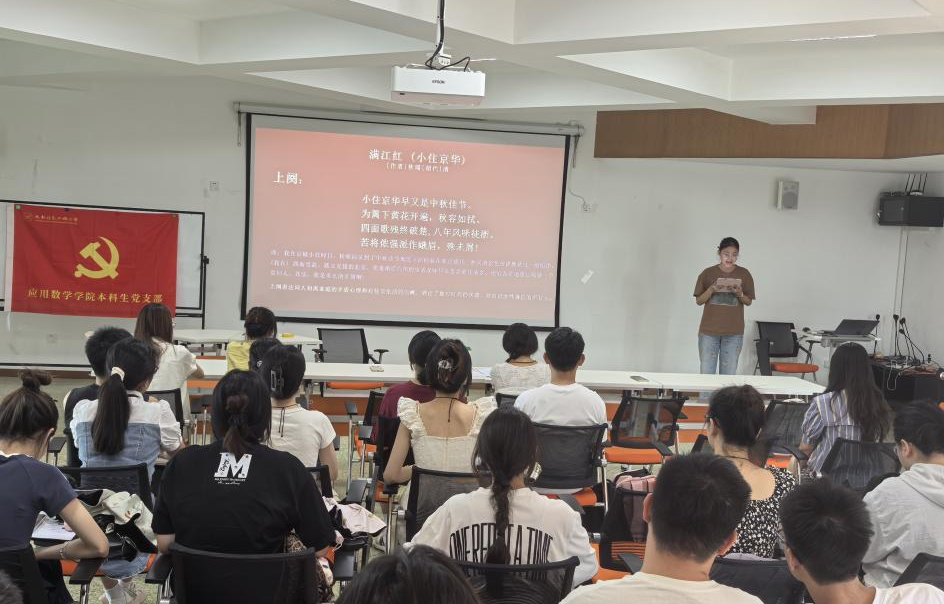 会议第三项,本次“青年党员说”环节由柏忠良同志和龚净茹同志上台进行分享。柏忠良同志分享了党员黄文秀主动请缨回到家乡百色,任乐业县百坭村第一书记,遍访贫困户、发展特色产业、改善基础设施,一心只为带领村民脱贫,最终在冒雨返村途中因公殉职的故事,以生命践行初心使命,感召同志们学习其无私奉献、勇于担当的崇高精神。龚净茹同志分享了革命烈士秋瑾的诗词及传奇一生,鼓励大学生党员要学习其英勇无畏的坚毅品质,充分展现出当代大学生党员的良好精神风貌。